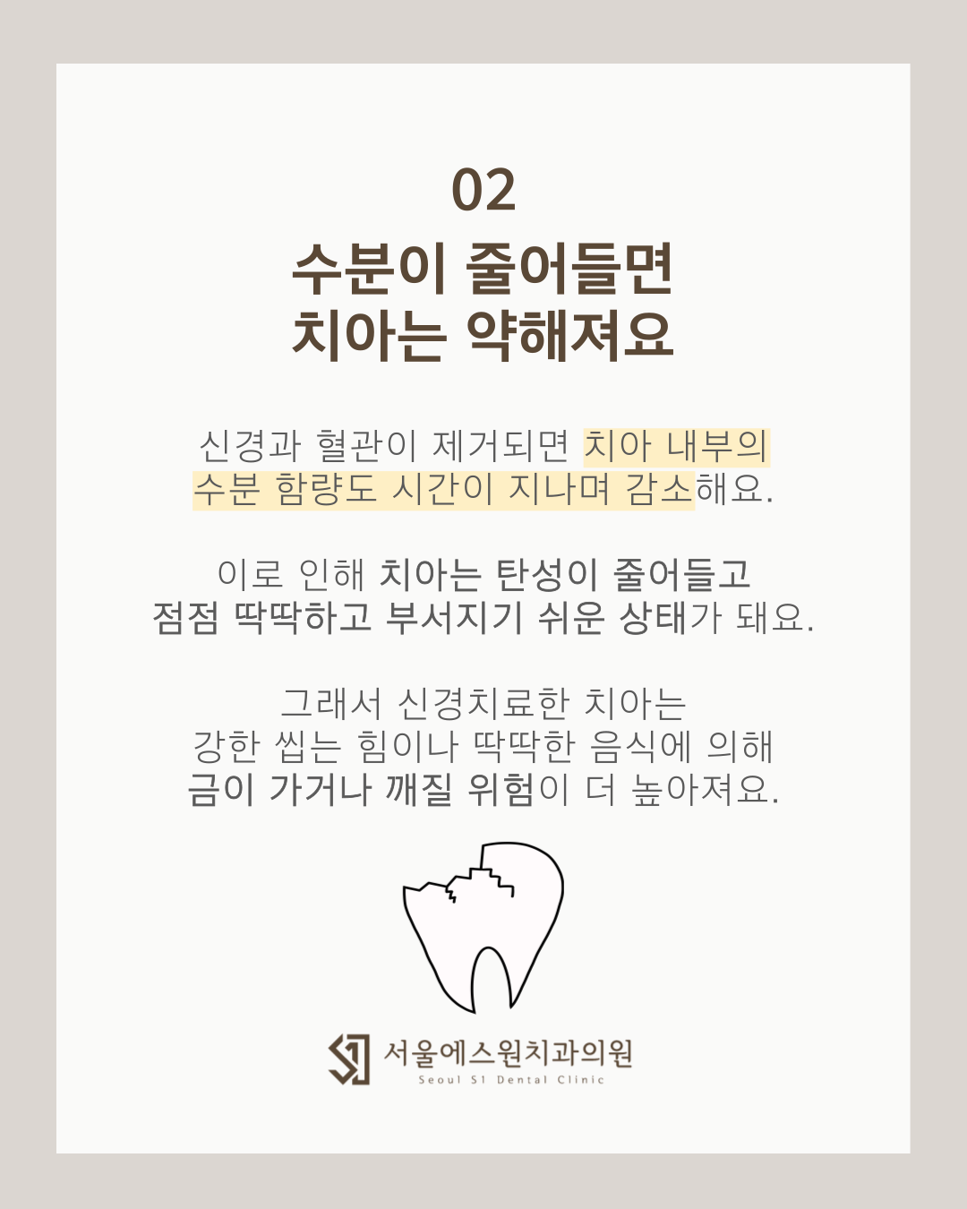 이 덕분에 씹는 기능은 유지할 수 있지만, 치아 내부 환경은 치료 전과 완전히 달라지게 돼요. ![]() 신경과 혈관이 제거된 치아는 더 이상 혈액을 통해 영양과 수분을 공급받지 못해요.