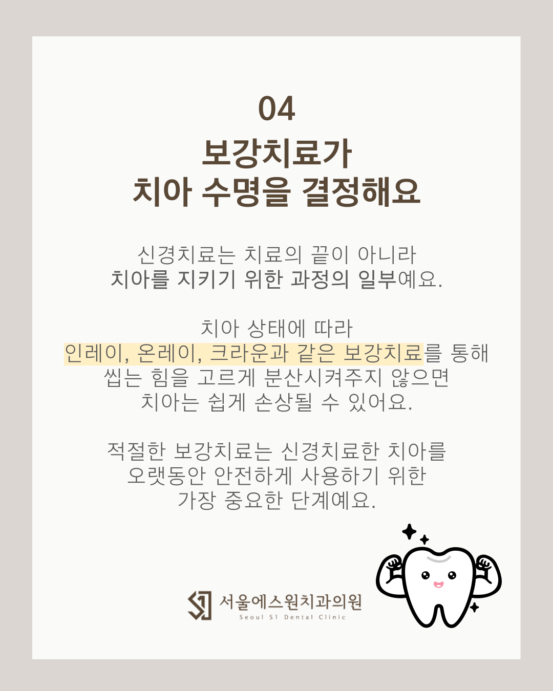 적절한 보강치료를 통해 치아의 수명을 크게 늘릴 수 있어요. 그렇기 때문에 신경치료는 치료의 끝이 아니라