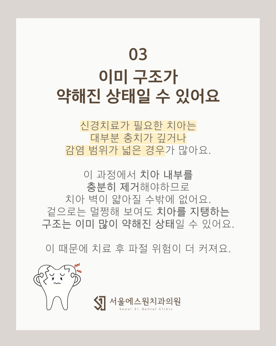 또 하나 중요한 점은 신경치료가 필요한 치아는 이미 충치가 깊거나 감염 범위가 넓었던 경우가 많다는 거예요.